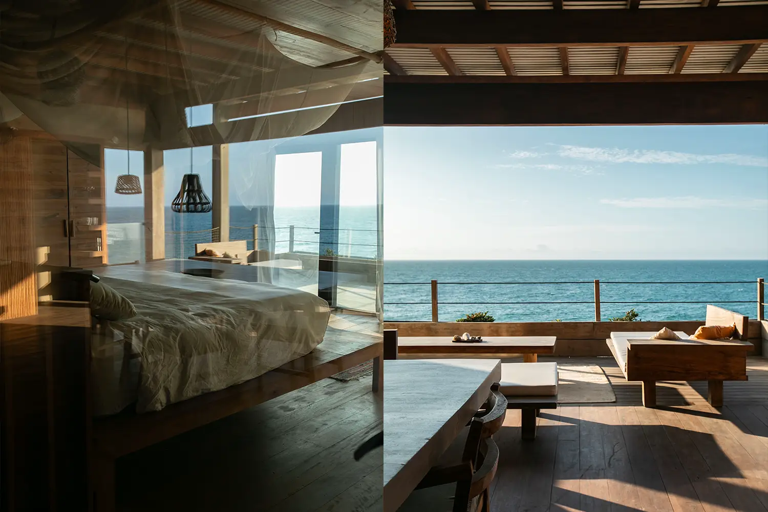 Rooms for 2 guests featuring king-size beds, private terraces with ocean views, and open-air bathtubs.