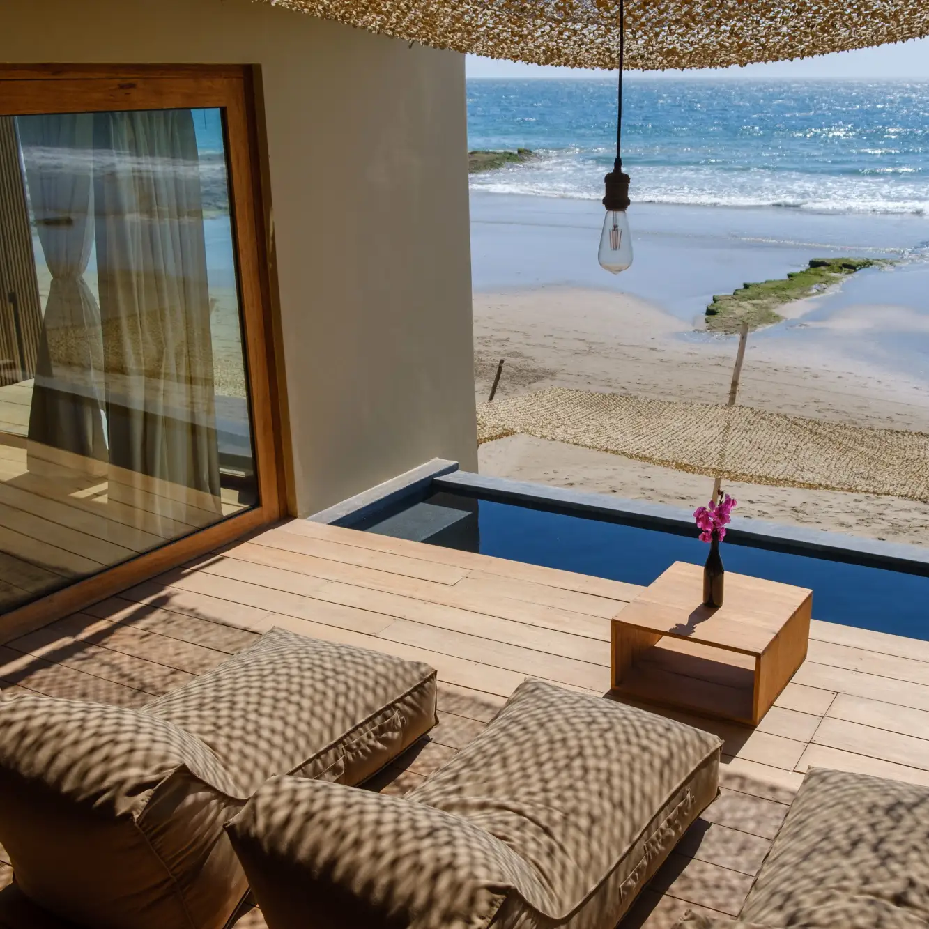 Una habitación para 2 personas de 49m2 equipada con una cama kingsize, ubicada en el segundo nivel. Tiene acceso a un terraza privada con vista a la playa con una deliciosa tina al aire libre, encontrándose junto a la piscina común del hotel. Cuenta con un closet y baño privado.