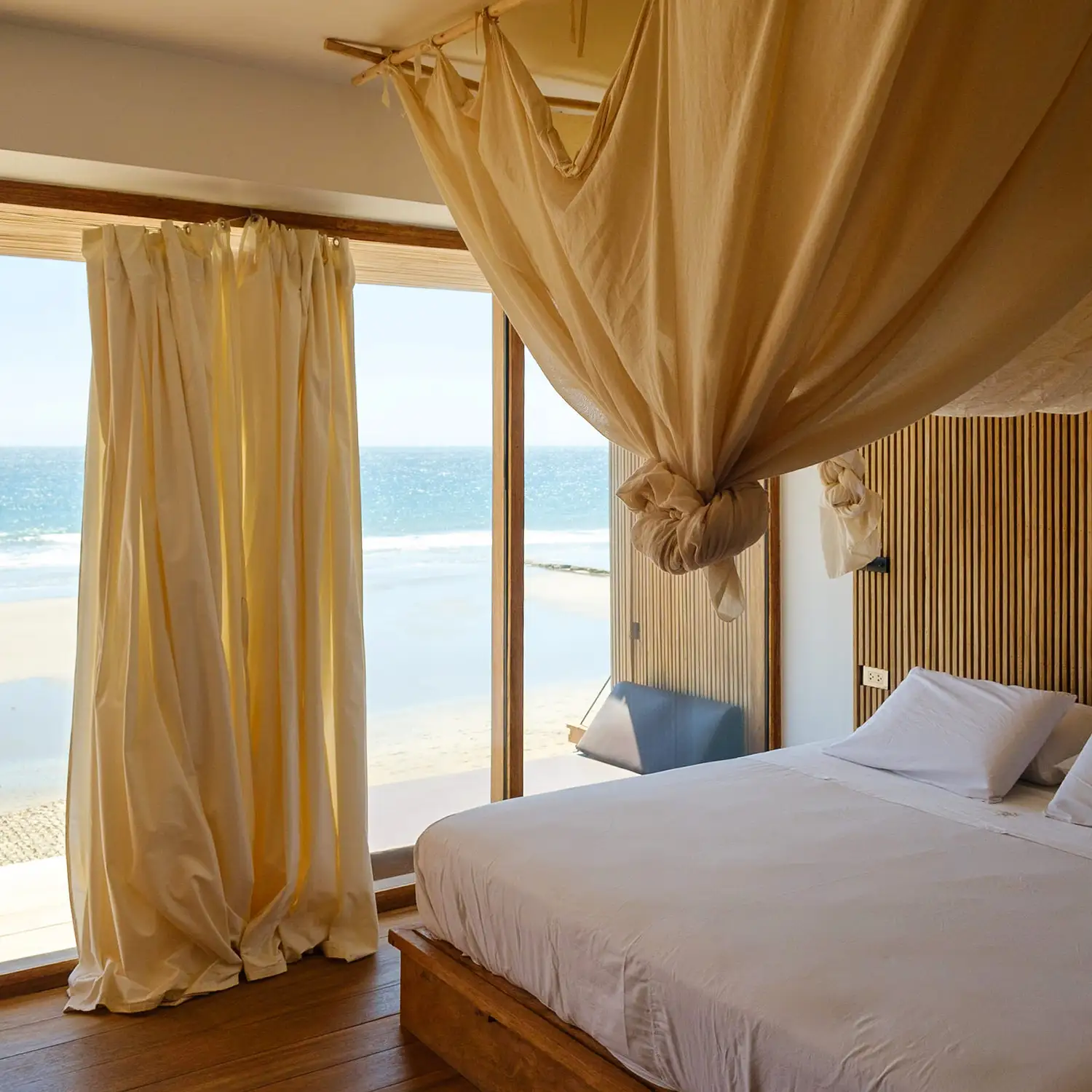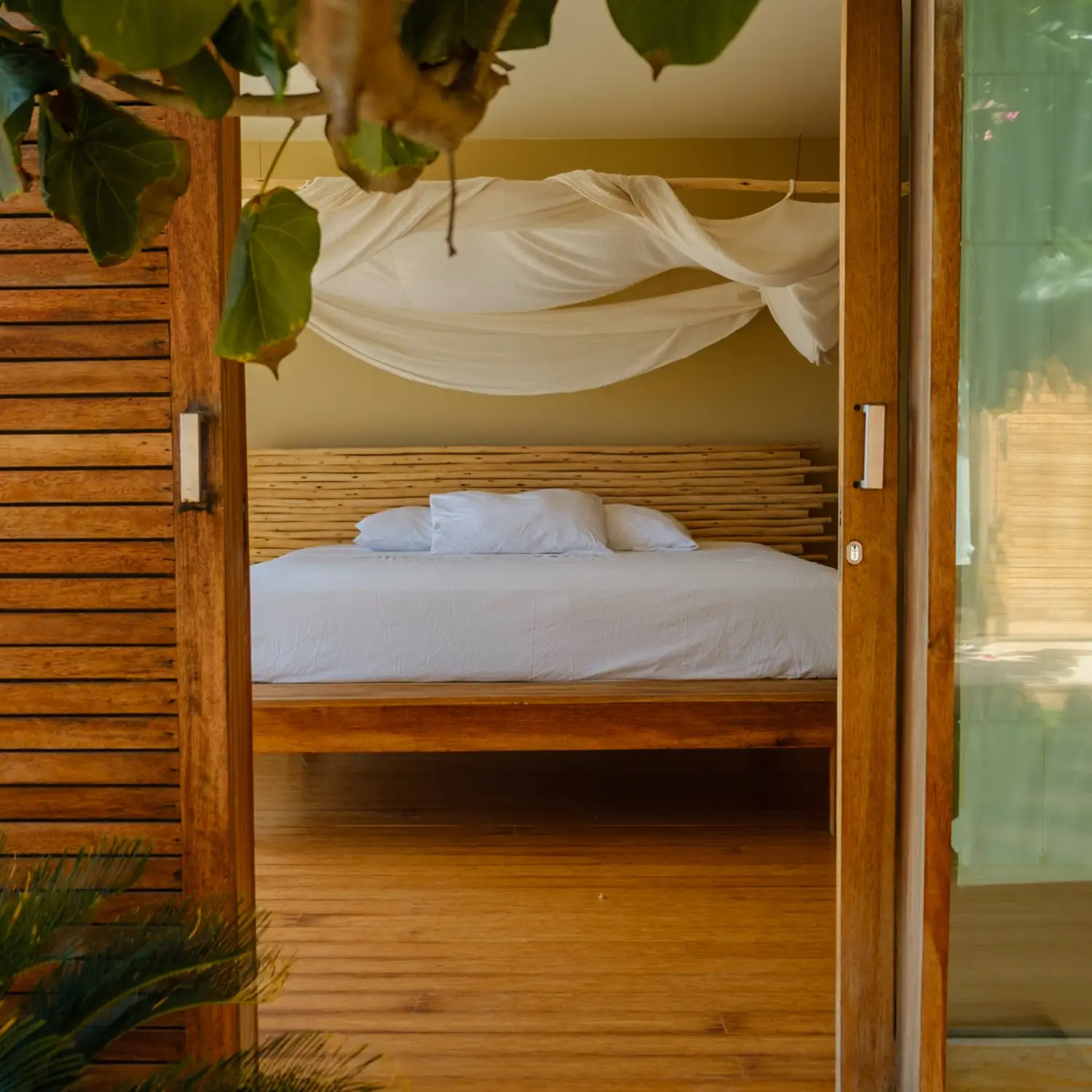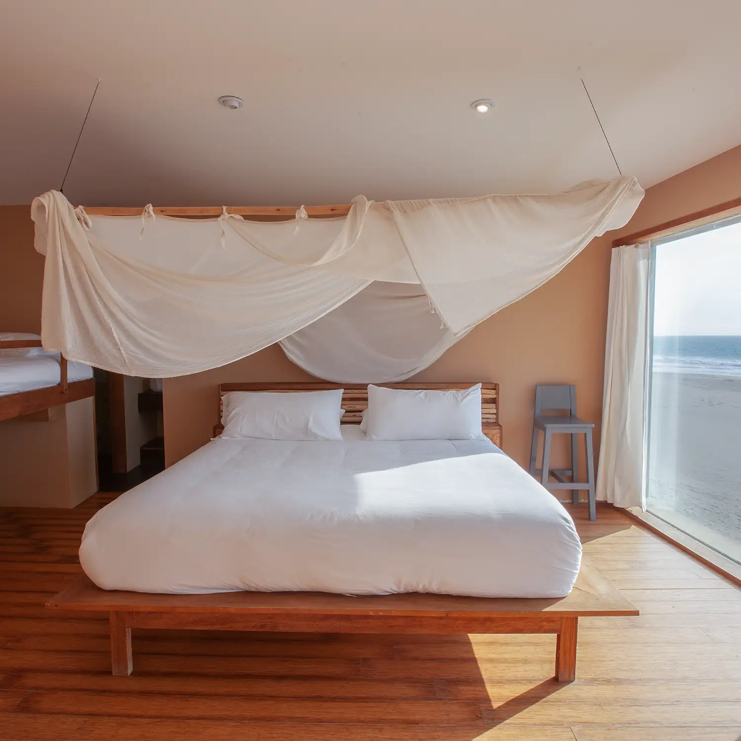 Una habitación íntima de 71m2 de hasta para cuatro personas, equipada con una cama kingsize y 2 camas estilo camarote. Ubicada en el 2do nivel. Cuenta con un clóset, baño privado y acceso a una terraza con vista a la playa.