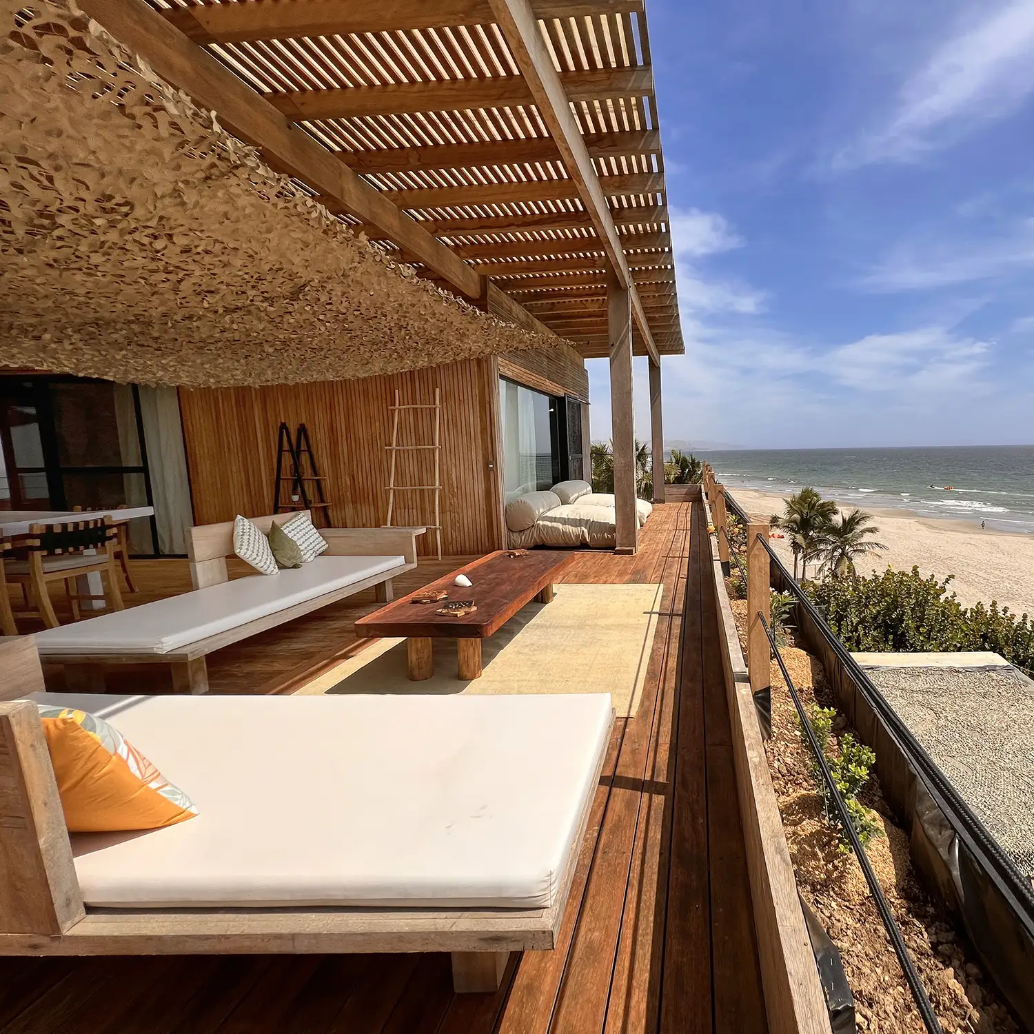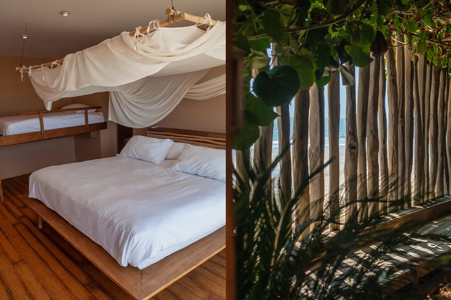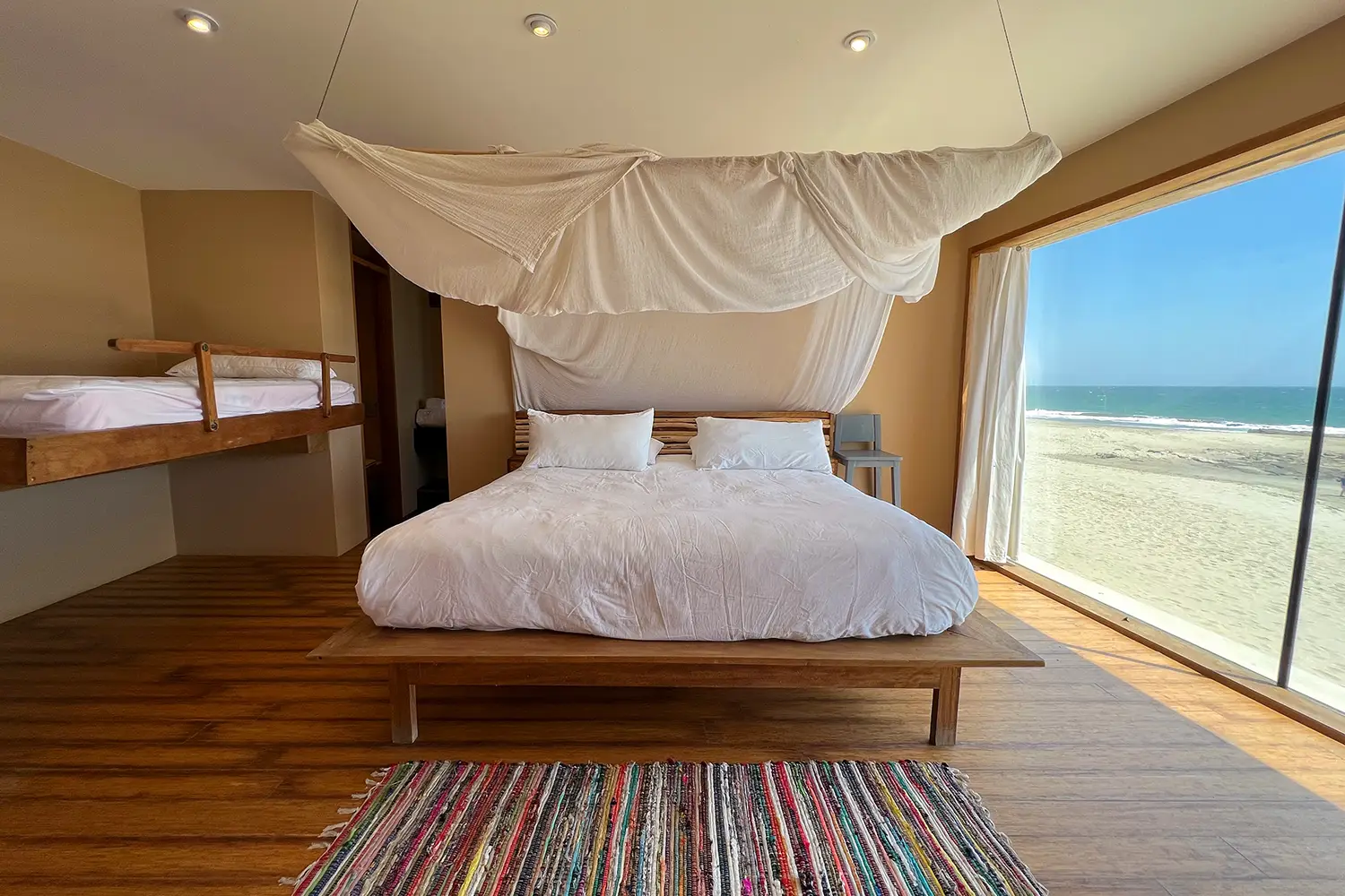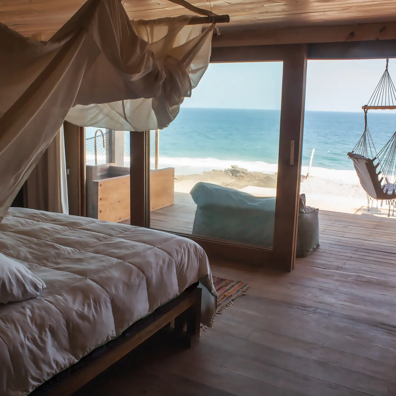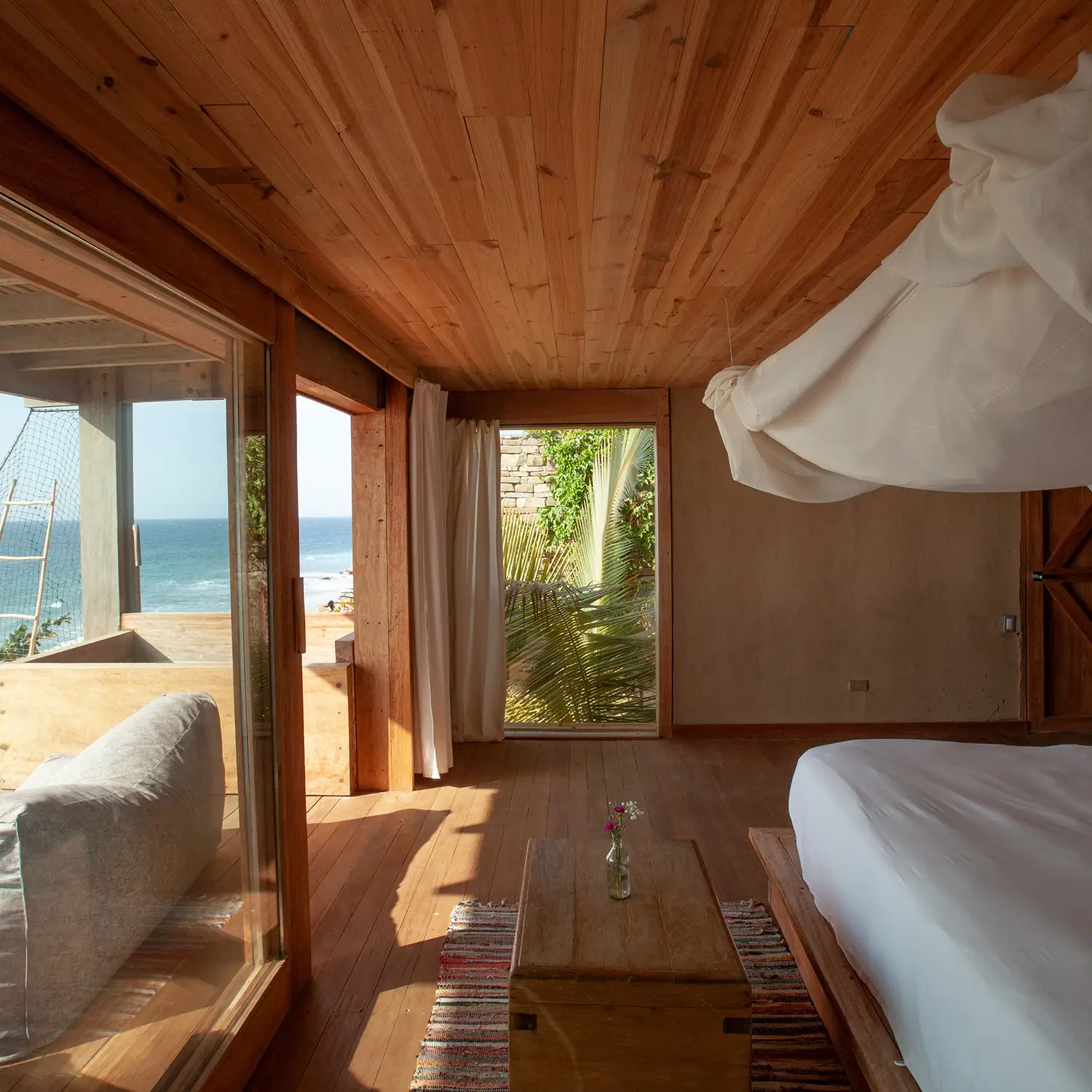 Una habitación íntima de 71m2 de hasta para cuatro personas, equipada con una cama kingsize y 2 camas estilo camarote. Ubicada en el 2do nivel. Cuenta con un clóset, baño privado y acceso a una terraza con vista a la playa.