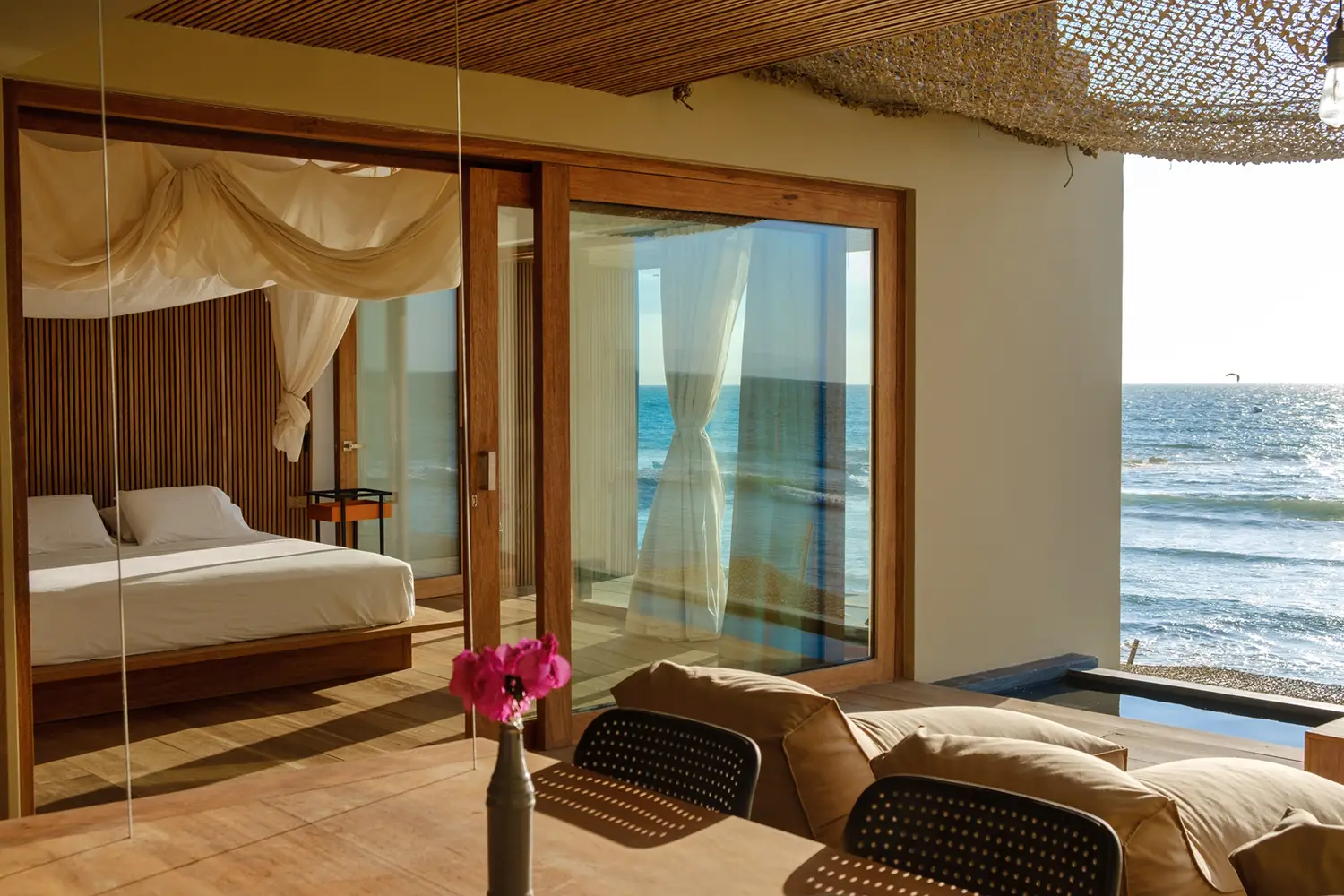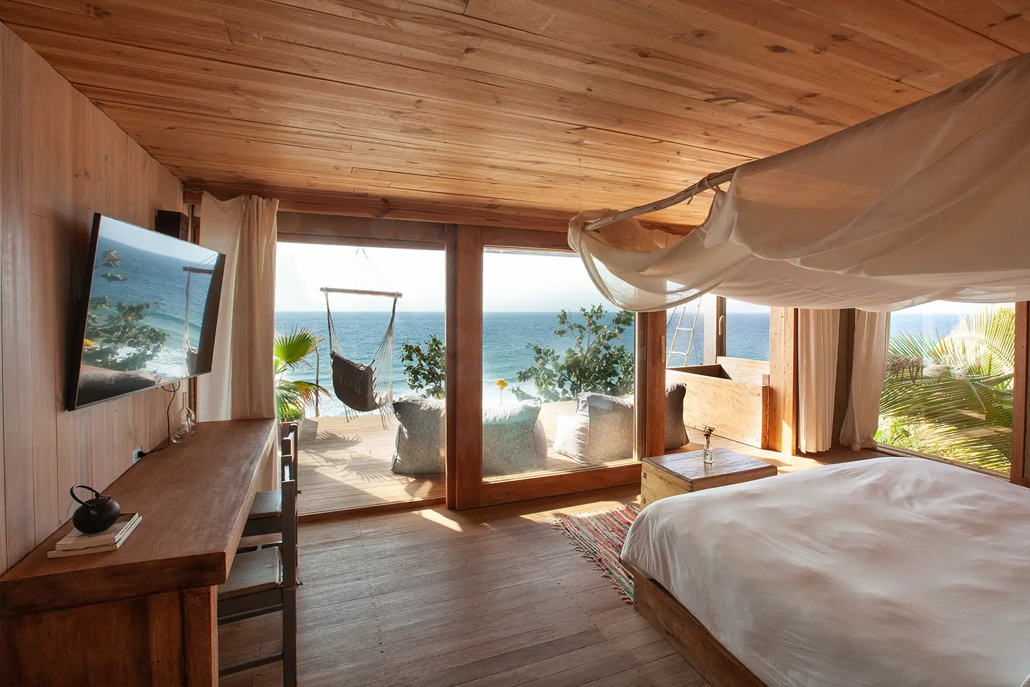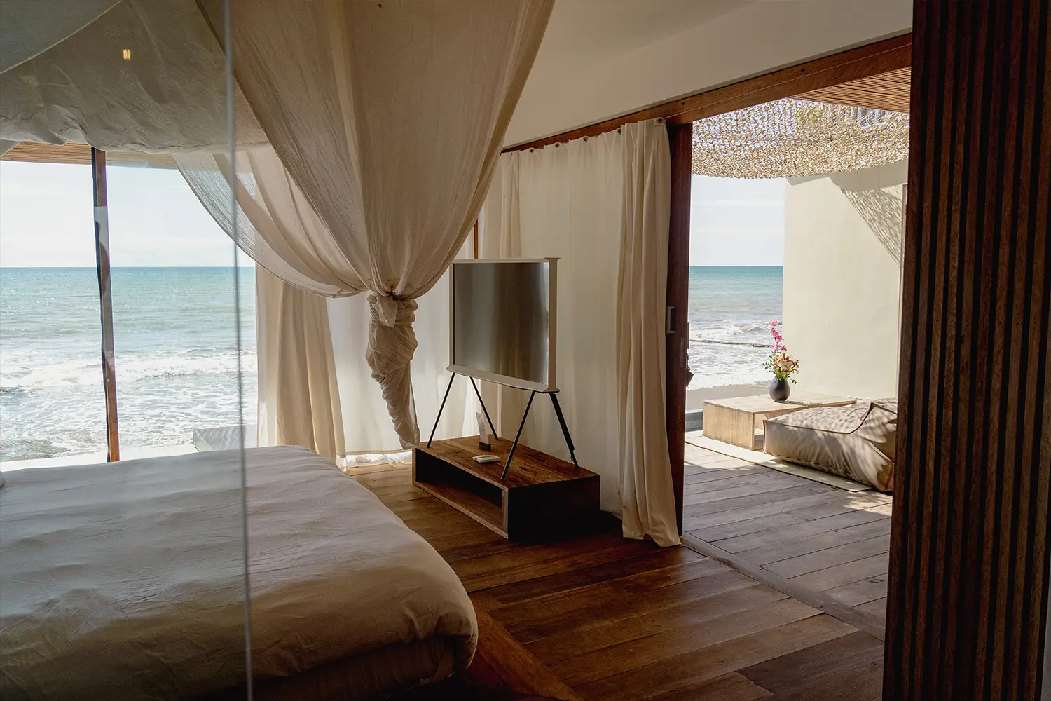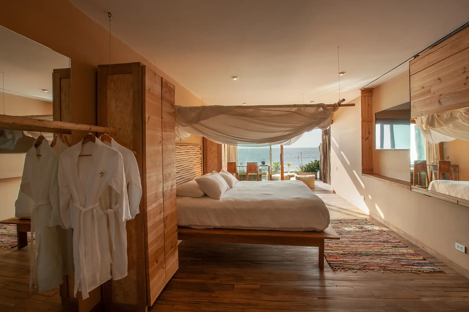 Una habitación íntima de 71m2 de hasta para cuatro personas, equipada con una cama kingsize y 2 camas estilo camarote. Ubicada en el 2do nivel. Cuenta con un clóset, baño privado y acceso a una terraza con vista a la playa.