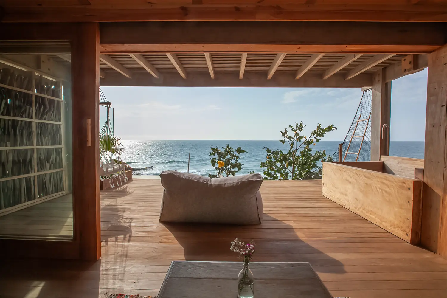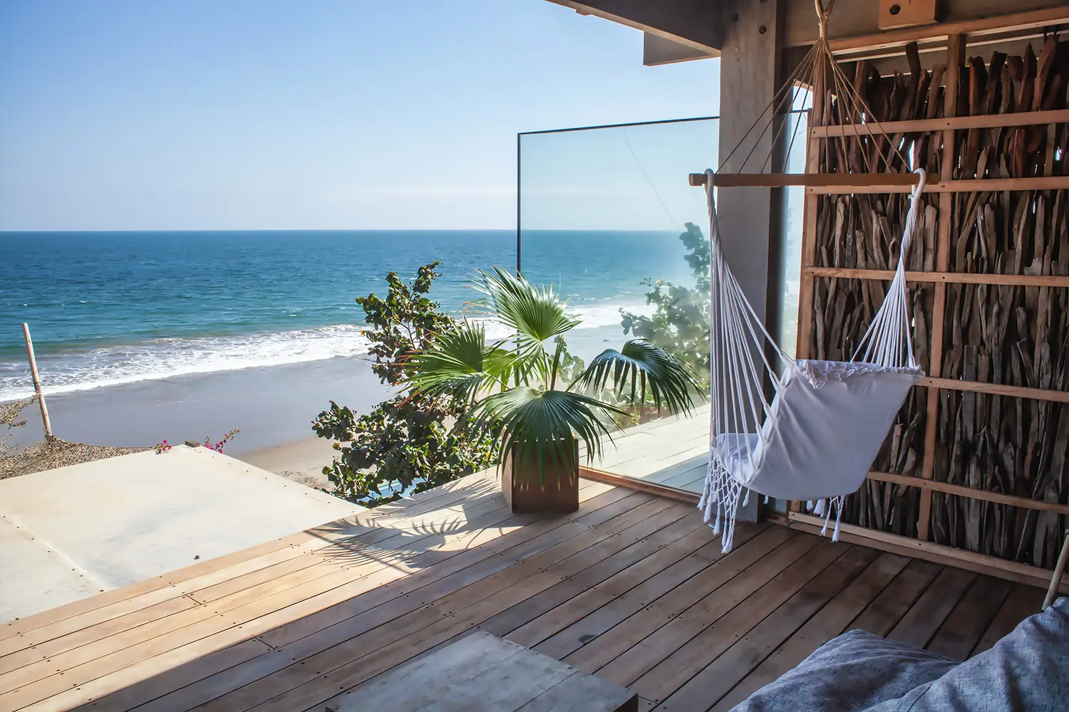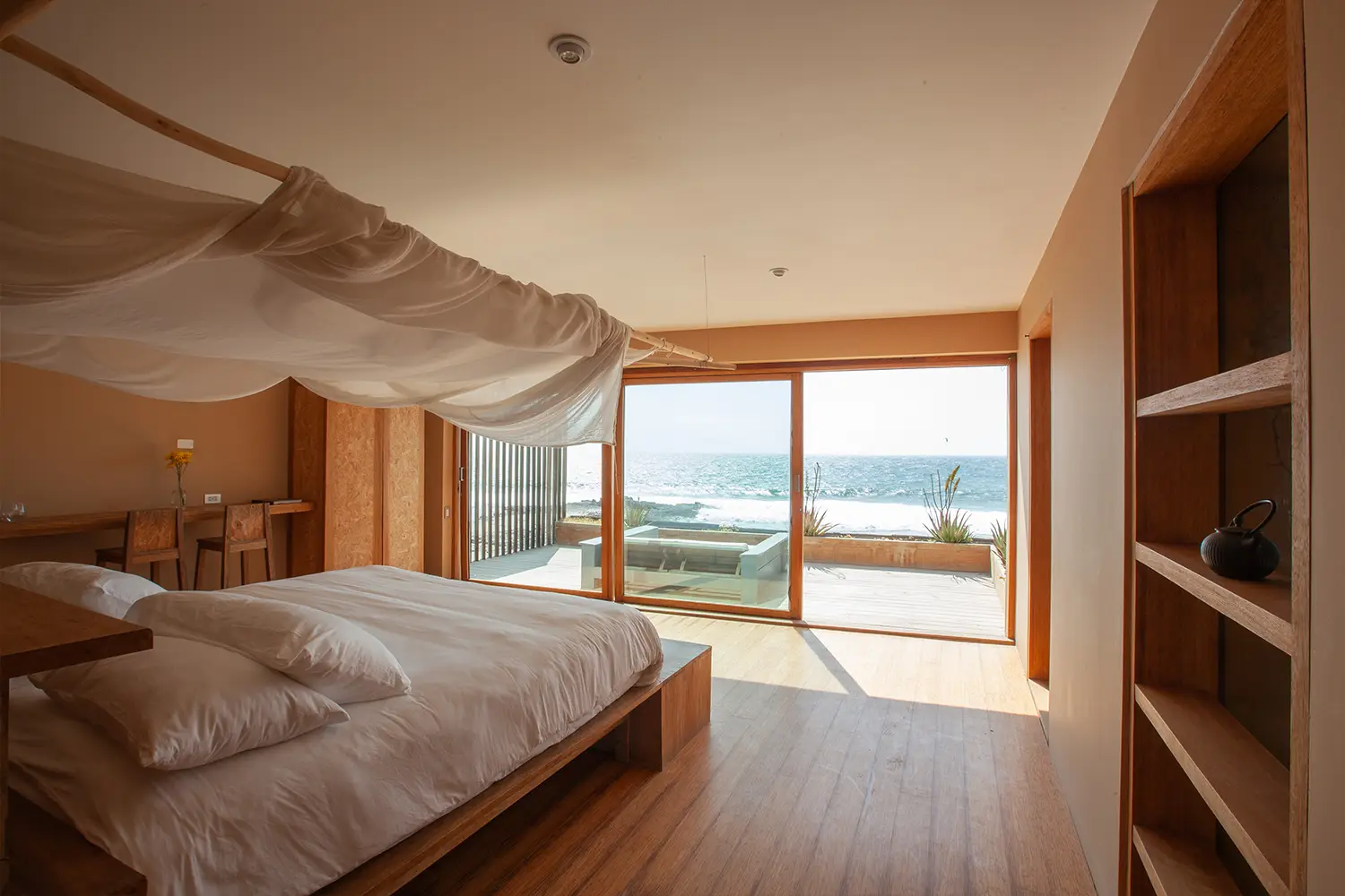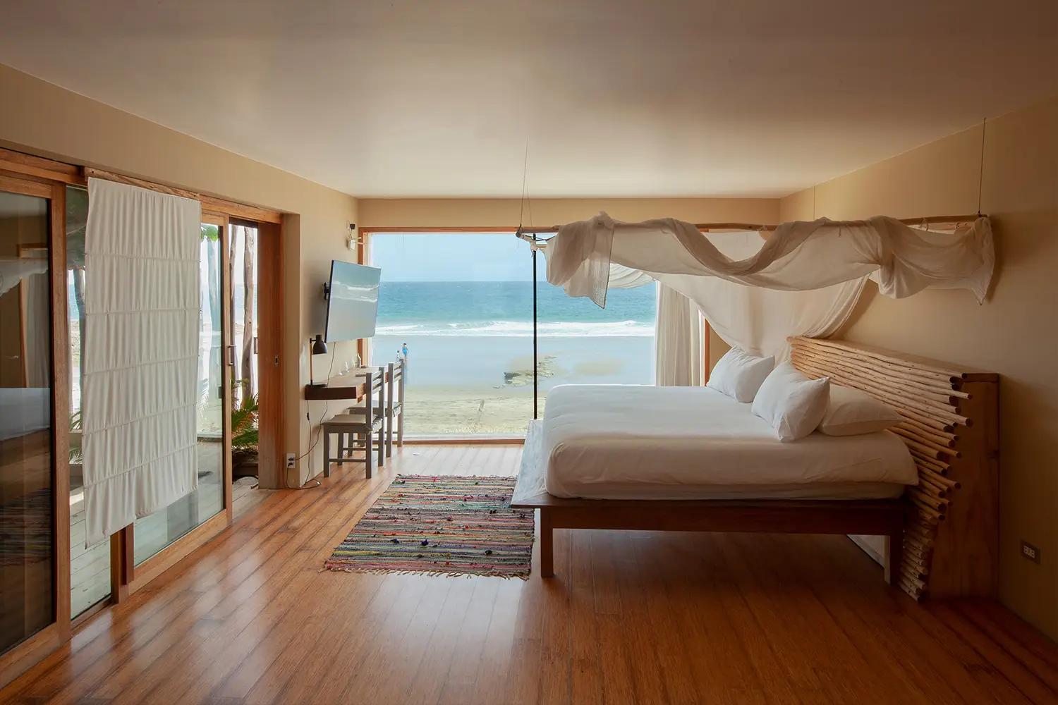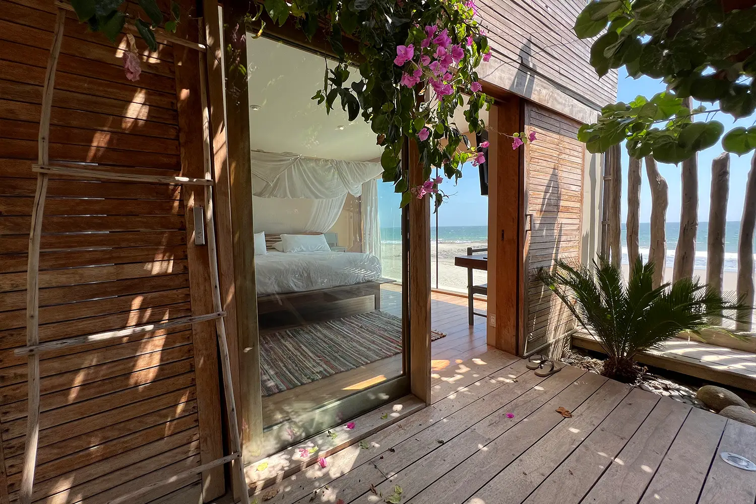 Una habitación íntima de 71m2 de hasta para cuatro personas, equipada con una cama kingsize y 2 camas estilo camarote. Ubicada en el 2do nivel. Cuenta con un clóset, baño privado y acceso a una terraza con vista a la playa.