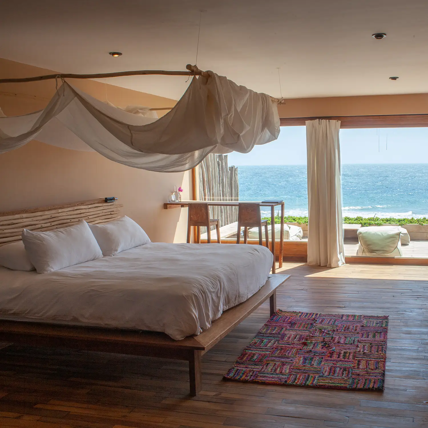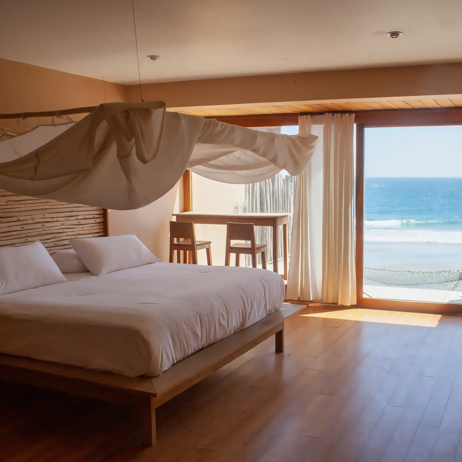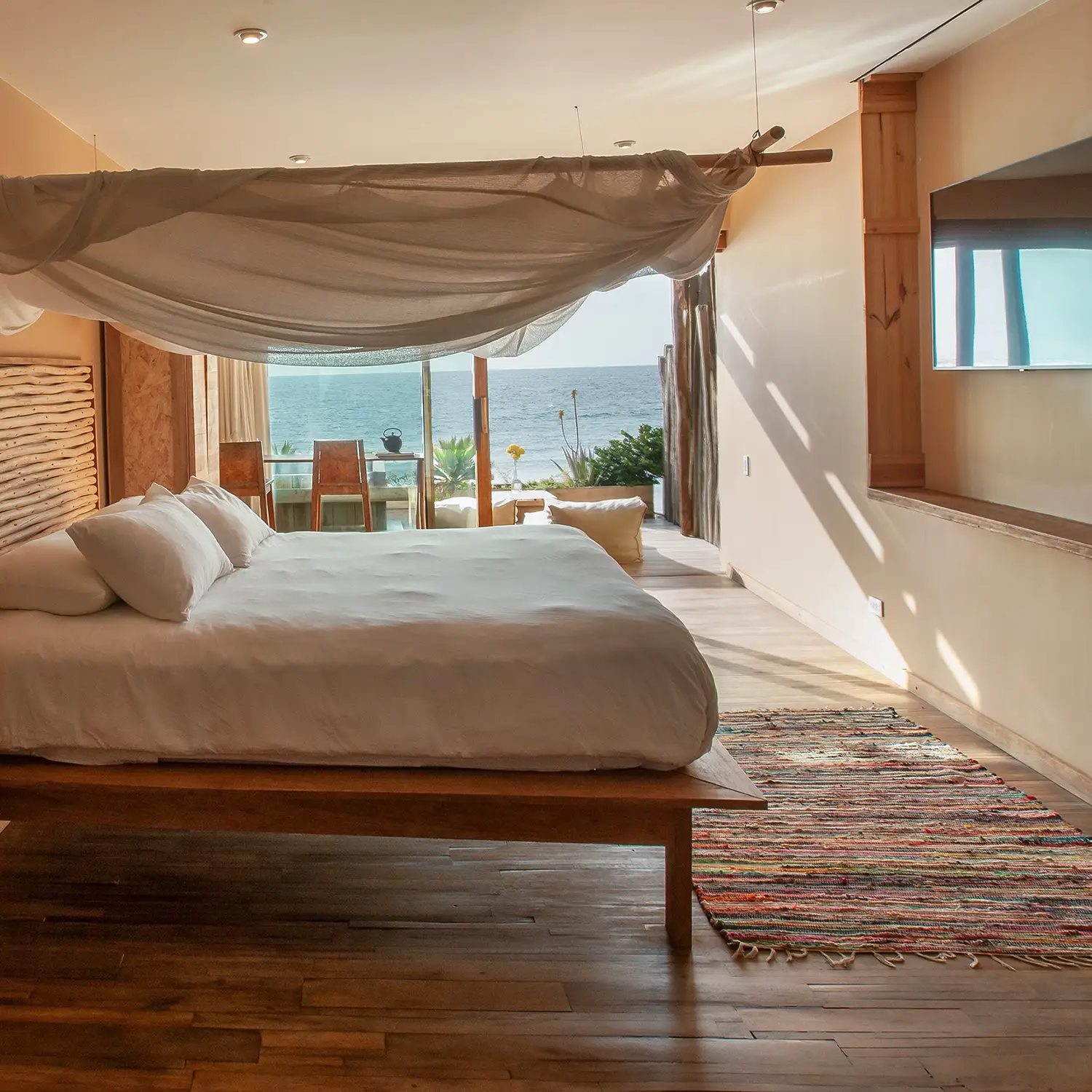 Habitación para 2 personas de 70m2 equipada con una cama kingsize, ubicada en el cuarto nivel. Tiene acceso a un terraza privada con vista a la playa con una deliciosa tina al aire libre. Cuenta con un clóset y baño privado.