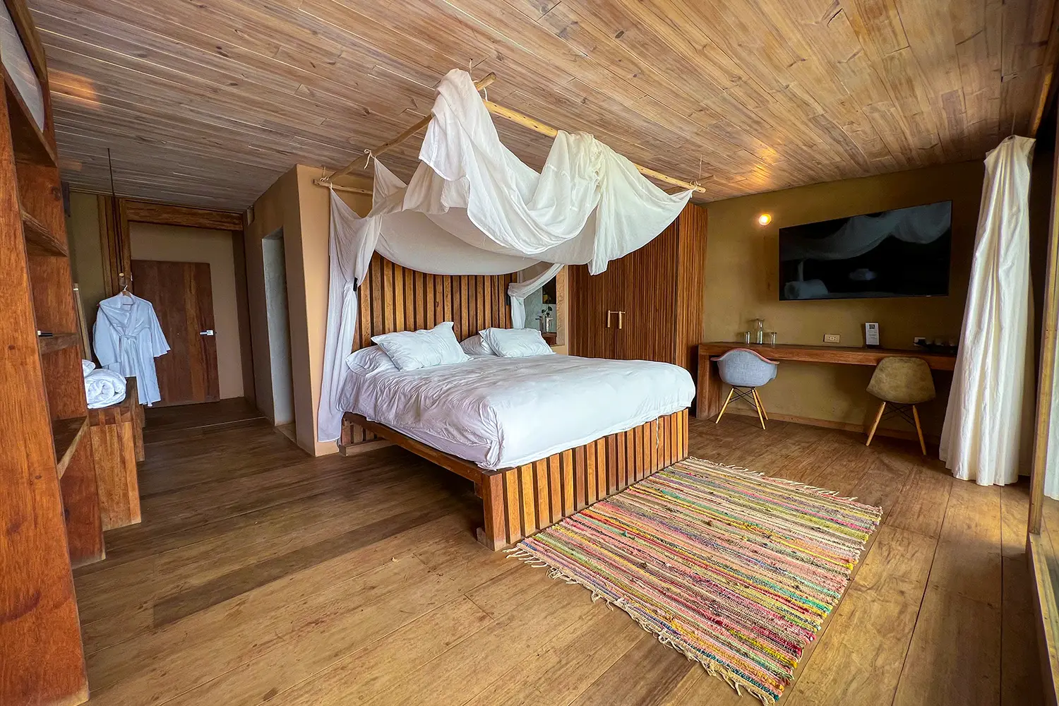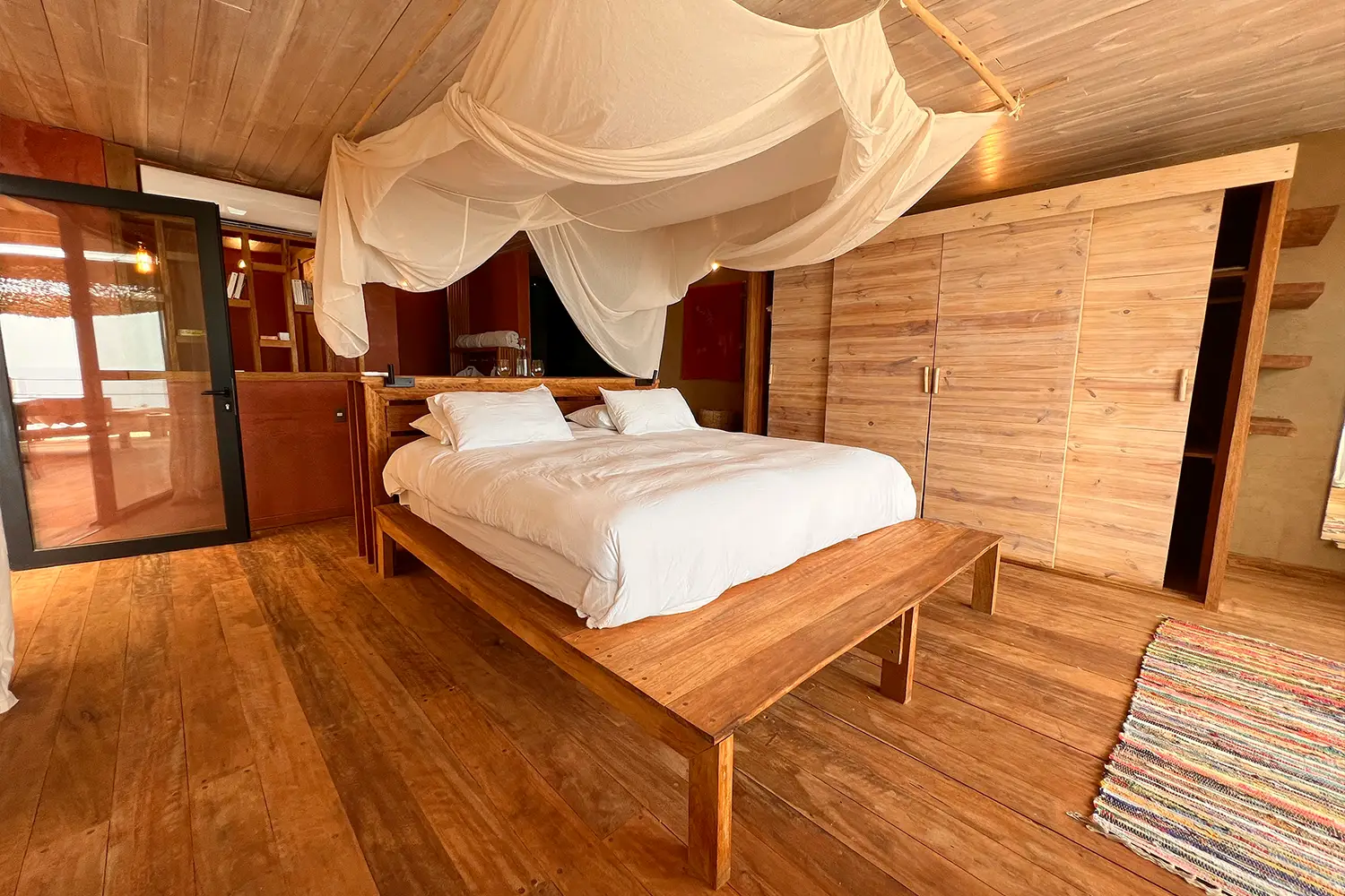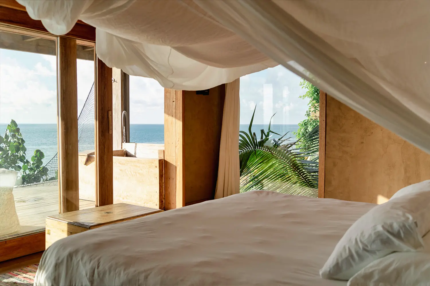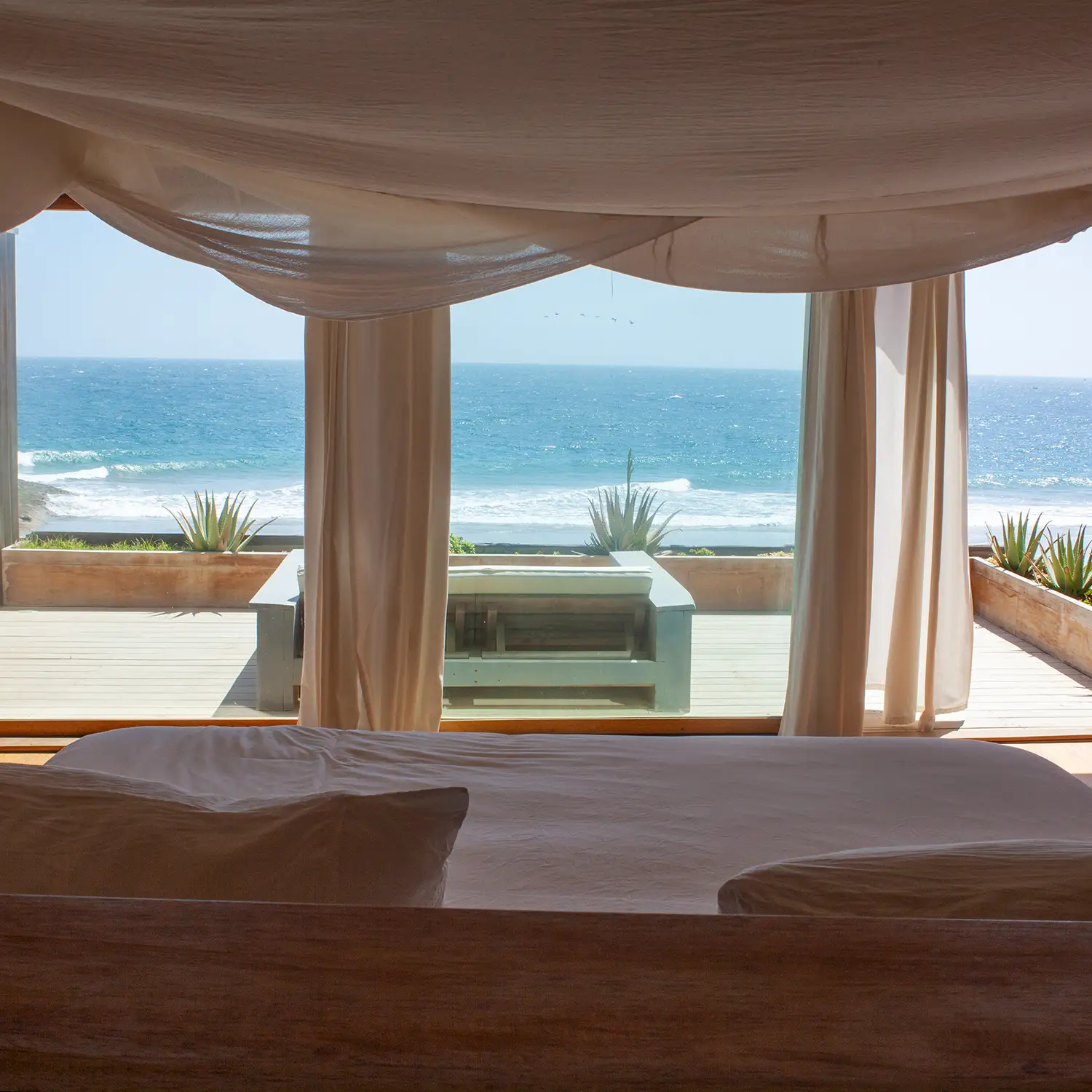 Habitación para 2 personas de 70m2 equipada con una cama kingsize, ubicada en el cuarto nivel. Tiene acceso a un terraza privada con vista a la playa con una deliciosa tina al aire libre. Cuenta con un clóset y baño privado.