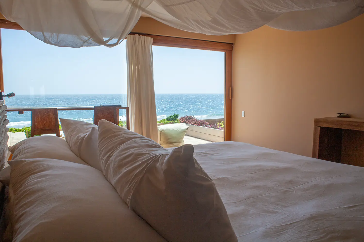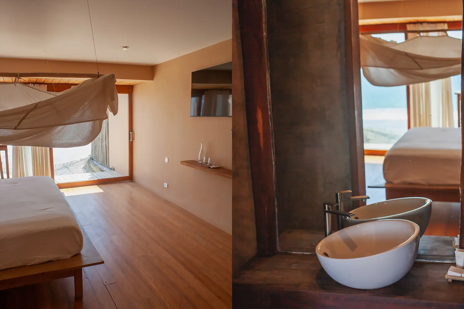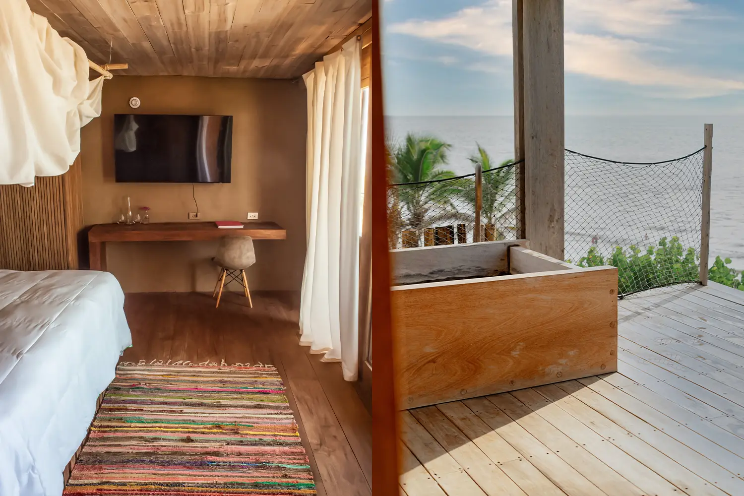 Habitaciones para 2 personas con camas kingsize, terraza privadas con vista al mar y tina al aire libre.